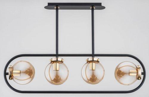 Люстра лофт виробництва компанії ALFA (Польща);Матеріали: метал, скло;Колір основи: чорний+золото;Колір плафонів: бурштиновий;Висота: 53 см; дліна: 80 см; лампи: 4 х Е-14 х 60 Вт..